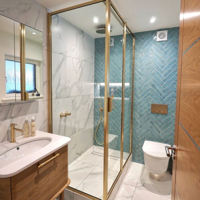 We designed this bathroom to combine fresh colors with elegant details, enhanced by brushed brass fixtures that bring warmth and subtle luxury. Behind the shower, we created a striking herringbone feature wall to add depth and visual interest, making it a focal point that elevates the entire space.